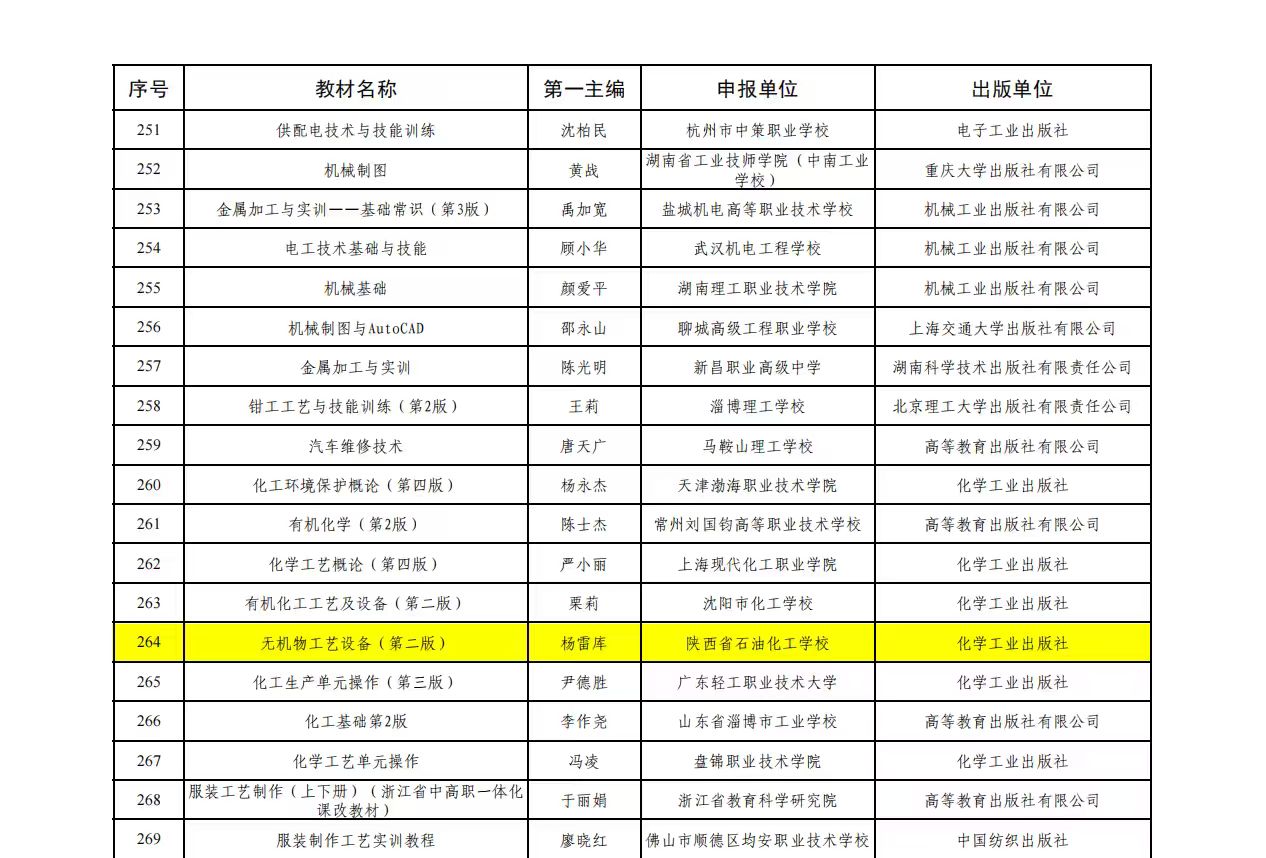 近日,教育部正式发布第二批 “十四五” 职业教育国家规划教材公告,我校杨雷库老师主编的《无机物工艺及设备》(第二版)成功入选,这是我校在职业教育教材建设领域取得的重要成果,标志着我校教材建设水平得到国家层面的高度认可。